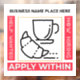Aide Recherché maintenant Embaucher Appliquer Custom Window Cling est un grand affichage publicitaire ou un signe pour votre entreprise lors de l'embauche de nouveaux employés. Il est unique et invitant à regarder. Il vous aidera à répandre le mot que vous embauchez et que vous interviewez. Personnalisez-le avec votre nom d'entreprise et votre image pour votre entreprise ou organisation. Il conviendra à de nombreuses entreprises pour l'embauche.