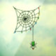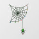 Une araignée verte mignonne et déplaisante est accrochée à sa toile d'angle tenant un ornement. La toile d'araignée est couverte de lumières de Noël lumineuses. Grand rebondissement sur une image traditionnelle de vacances, par Briana Blair.