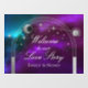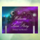 Bienvenue dans notre histoire d'amour Violet sarcelle céleste Autocollant de fenêtre Signe de bienvenue de mariage Autocollant de fenêtre présente un soleil, une lune et des étoiles argentés avec un cadre argenté sur un fond cosmique violet, sarcelle et bleu mystique coloré. À l'intérieur du cadre se trouve le texte "Bienvenue dans notre histoire d'amour" en élégante écriture calligraphique blanche avec vos noms en dessous. Conçu pour vous par ©2024 Evco Studio www.zazzle.com/store/evcostudio