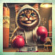 L'image montre un chat anthropomorphique dans un ring de boxe. Le chat porte un sweat - shirt à capuche gris avec le capuchon sur les oreilles et les gants de boxe rouge. Le gros sourire à l'aspect humain du chat est particulièrement frappant, donnant à l'image une expression humoristique, presque folle. L'arrière - plan montre un anneau de boxe classique avec des sacs perforants, des affiches et un éclairage tamisé, ce qui renforce l'atmosphère combative, mais drôle.