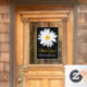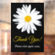 Cette fenêtre personnalisable accrochée pour une entreprise a une grande image de tête de fleur Shasta Daisy blanche et jaune sur un arrière - plan noir. Changez la photo en l'une de vos photos ou de votre logo d'entreprise. Il y a aussi des textes jaunes et blancs personnalisables qui disent, "Merci !" et "S'il vous plaît visiter à nouveau bientôt." sur elle qui est également personnalisable.