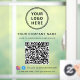 Panneau adhésif moderne pour vitrine pour votre entreprise. Entrez l'adresse URL de votre site web pour créer un code QR que les clients peuvent scanner pour obtenir une liste de vos produits, services et prix. Téléchargez votre logo et ajoutez le nom de votre entreprise, votre numéro de téléphone et votre adresse rue dans une typographie simple. Ajoutez vos identifiants d'utilisateur instagram et facebook pour que les clients puissent vous suivre sur les réseaux sociaux.