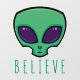 Illustration de la tête de l'alien de dessin avec de grands yeux foncés avec des lettres "Croire". Tags : alien, espace, martien, dessin animé, humour, science-fiction, vecteur, science-fiction, science fi, croire
