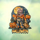 Éffrayant épouvantail d'Halloween avec jack-o-lanternes, maison hantée, pleine lune, et chauves-souris.