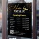 Annoncez les heures d'ouverture de votre salon avec cet autocollant de fenêtre élégant et accrocheur. Le design sophistiqué or et noir présente une police de caractères script stylée et un effet pailleté subtil, créant une atmosphère luxueuse. Cet autocollant de haute qualité est facile à appliquer et à enlever, ce qui le rend parfait pour les affichages temporaires ou les heures changeantes. Il fournit toutes les informations essentielles - jours, heures, coordonnées et un code QR pour un accès facile à votre site web - pour garder vos clients informés et engagés. Ce design élégant ajoutera une touche de glamour à la vitrine de votre salon, attirant les clients potentiels et faisant une impression durable.