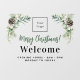 Un fond transparent et un texte noir. Personnalisez et ajoutez votre logo. Texte : Joyeux Noël ! et Bienvenue. Décoré de brindilles de pin et de cônes.