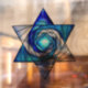 Décorez vos fenêtres et/ou vos portes pendant les vacances ou toute l'année "avec ce magnifique style Art Déco Magen David (Etoile de David) qui a l'air de vitraux dans les tons brillants de bleu et blanc royal. Design original par Leslie Sigal Javorek.