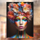 Le visage et le cou d'une femme sont ornés d'une peinture vibrante de couleur arc-en-ciel, coulant dans des rayures verticales sur son corps. Ses yeux sont accentués par un maquillage brillant, et elle porte une couronne de grandes fleurs colorées et stylisées. L'arrière - plan est un brun foncé et neutre, qui attire l'attention sur l'explosion de couleur sur le sujet.