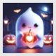 Un charmant fantôme de dessin animé se trouve au centre de l'image, illuminé par la lumière chaleureuse d'un citrouille sculpté au coeur. Le fantôme, avec ses joues rondes et rougissantes et ses yeux larges et innocents, dégage une aura amicale et adorable, qui contraste avec le fond éffrayant d'un cimetière illuminé par la lune. Les chauves-souris ont traversé l'arrière - plan, et des lanternes jack-o-lanternes aux grins menaçants flanquent le fantôme, ajoutant une touche d'ambiance classique d'Halloween.