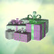 This window cling is a group of Christmas presents wrapped in shiny green and purple paper with pretty bows on top.