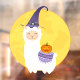 Mignonne lama blanche dans un casquette de sorcière violette portant un jack o'lantern. Pleine lune jaune dans l'arrière - plan et un arrière - plan pourpre-bleu poussiéreux.