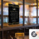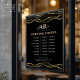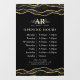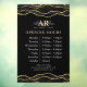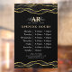 Fenêtre d'heures d'ouverture luxueuse avec un motif de marbre d'agate pailleté noir et or, et un fond noir. Parfait pour les salons de beauté, les coiffeurs, les artistes maquilleurs, les esthéticiennes, les salons de manucure, les spas et bien plus encore !