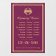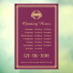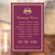 Affichez vos heures d'ouverture aux clients et aux clients grâce à cet élégant accrochage de fenêtre. Un design d'inspiration vintage avec typographie classique et une simple bordure art déco. Ce modèle professionnel est personnalisé avec le logo de votre entreprise, les heures d'ouverture, le numéro de téléphone et le site Web. Il offre un texte entièrement personnalisable pour s'adapter à votre marque d'entreprise. Vous pouvez également modifier la couleur de l'arrière - plan à l'aide de l'outil d'édition de conception. Ce design adaptable est idéal pour une variété d'établissements, de magasins, de bureaux ou de services, y compris des restaurants, des cafés, des salons, des boutiques, des services de nettoyage à sec, et plus encore! Couleurs imprimées : prune rose profonde et couleur or. Si vous souhaitez que votre logo soit coordonné avec la couleur de type or, le code couleur hexadécimal est #DEBE79
