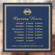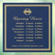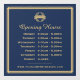 Affichez vos heures d'ouverture aux clients et aux clients grâce à cet élégant accrochage de fenêtre. Un design d'inspiration vintage avec typographie classique et une simple bordure art déco. Ce modèle professionnel est personnalisé avec le logo de votre entreprise, les horaires d'ouverture et le site Web. Il offre un texte entièrement personnalisable pour s'adapter à votre marque d'entreprise. Vous pouvez également modifier la couleur de l'arrière - plan à l'aide de l'outil d'édition de conception. Ce design adaptable est idéal pour une variété d'établissements, de magasins, de bureaux ou de services, y compris des restaurants, des cafés, des salons, des boutiques, des services de nettoyage à sec, et plus encore! Couleurs imprimées : bleu marine très foncé et couleur or. Si vous souhaitez que votre logo soit coordonné avec la couleur de type or, le code couleur hexadécimal est #DEBE79