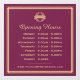 Affichez vos heures d'ouverture aux clients et aux clients grâce à cet élégant accrochage de fenêtre. Un design d'inspiration vintage avec typographie classique et une simple bordure art déco. Ce modèle professionnel est personnalisé avec le logo de votre entreprise, les horaires d'ouverture et le site Web. Il offre un texte entièrement personnalisable pour s'adapter à votre marque d'entreprise. Vous pouvez également modifier la couleur de l'arrière - plan à l'aide de l'outil d'édition de conception. Ce design adaptable est idéal pour une variété d'établissements, de magasins, de bureaux ou de services, y compris des restaurants, des cafés, des salons, des boutiques, des services de nettoyage à sec, et plus encore! Couleurs imprimées : prune rose profonde et couleur or. Si vous souhaitez que votre logo soit coordonné avec la couleur de type or, le code couleur hexadécimal est #DEBE79