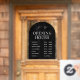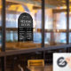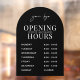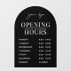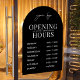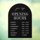 Modèle de décalque de fenêtre d'horaires d'ouverture minimaliste d'entreprise avec conception d'arche noire et disposition de texte blanc simple. Ce panneau d'horaires d'ouverture entièrement modifiable comprend un espace pour votre logo d'entreprise, vos heures de travail et votre numéro de téléphone. Un excellent moyen d'afficher vos jours et heures d'ouverture sur la vitrine de votre magasin - peut être utilisé pour votre café, restaurant, salon ou toute autre entreprise.