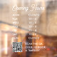 Vous cherchez un adhésif de fenêtre propre pour partager vos heures avec un code QR pour réserver en ligne ? Ce panneau d'heures d'ouverture personnalisé et sur mesure ajoute une touche de script élégant pour toute petite entreprise. Minimaliste, professionnel et convivial pour les salons, les boutiques et les studios.
