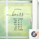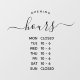 Décal de fenêtre moderne lisant vos heures d'ouverture / d'affaires dans une typographie chaude et moderne et un script écrit à la main. Solution simple et élégante pour toute petite entreprise.