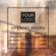 Horaires d'ouverture fermeture de fenêtre avec du texte en noir ou en couleur sur un arrière - plan transparent et un modèle de logo personnalisé.