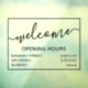 Horaires d'ouverture Cling de fenêtre avec du texte en noir ou en couleur sur un arrière - plan transparent avec le texte "bienvenue" dans une police de script de calligraphie élégante.