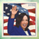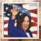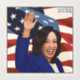 Portrait de la candidate à la présidentielle Kamala Harris avec les étoiles et les rayures et le vent derrière elle.