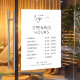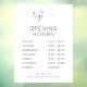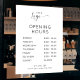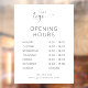 Modèle de sticker de fenêtre pour heures d'ouverture en blanc pour entreprise, avec un design élégant et des polices minimalistes. Ce panneau vinyle d'horaires d'ouverture dispose d'un espace pour votre logo d'entreprise, vos heures d'ouverture, votre numéro de téléphone et votre site web. Ce sticker entièrement modifiable est un excellent moyen d'afficher vos jours et heures d'ouverture sur la vitrine de votre magasin - utilisez-le pour votre boutique, restaurant, salon ou toute autre entreprise.
