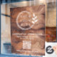 Logo de menuiserie moderne en bois élégant Code QR Construction Bannière d'entreprise Panneau de fenêtre Cling dispose d'un élégant arrière - plan motif de meubles en bois avec votre nom d'entreprise, site Web ou texte personnalisé, logo et code QR. Personnalisez en modifiant le texte dans la zone de texte fournie. Conçu par ©Evco Studio www.zazzle.com/studio/evcostudio
