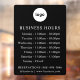 Créez facilement un panneau d'horaires d'ouverture personnalisé avec votre logo, vos heures d'ouverture et vos coordonnées ! Essayez-le et voyez à quoi cela ressemble. Ajoutez n'importe quelle forme ou logo avec un arrière-plan transparent ou uni. Votre image de logo s'adaptera à la zone supérieure. Ajustez les jours et les heures pour les adapter à votre entreprise et ajoutez vos coordonnées. De nombreuses options de panneaux sont disponibles pour différentes applications. Consultez la collection "Panneaux d'entreprise" pour d'autres panneaux d'entreprise utiles et informatifs.