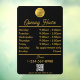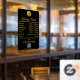 Un autocollant de fenêtre d'heures d'ouverture d'affaires en écriture noir or et un adhésif de fenêtre présentant le logo de l'entreprise, le code QR, vos icônes de médias sociaux personnalisés et les coordonnées. Un adhésif de fenêtre d'heures de magasin personnalisé parfait pour les vitrines et les panneaux de porte d'entrée. Parfait pour un propriétaire de magasin qui souhaite informer ses clients de ses heures d'ouverture.