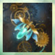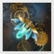 Luciole à vapeur avec ailes bleues transparentes et ampoule verte sur arrière - plan usé, marron, texturé. Style Steampunk.