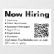Ceci est un modèle de panneau « Nous embauchons maintenant ». Le titre indique « Nous embauchons ». Il y a 6 titres de poste énumérés que vous pouvez modifier en fonction des postes disponibles dans votre entreprise. Du texte supplémentaire est en bas que vous pouvez modifier. Tout le texte est noir et peut être modifié ou supprimé. Un code QR est sur le panneau. Vous devez entrer l'URL de votre site Web pour que le code QR fonctionne correctement.