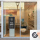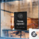 Un logo noir moderne d'entreprise avec les heures d'ouverture en vinyle adhésif pour fenêtre avec une typographie classique dans un style minimaliste. Le modèle peut être facilement mis à jour avec le logo de votre entreprise et vos heures d'ouverture.