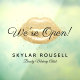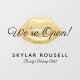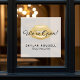 Faites la promotion de votre salon de beauté, de vos services de maquillage et plus encore avec notre élégant autocollant de vitrine de salon ouvert. Le design présente des lèvres pailletées dorées fausses élégantes le long du haut avec "Nous sommes ouverts !" affiché en typographie script élégante. Conception graphique de lèvres pailletées dorées personnalisée avec le nom de votre entreprise. Œuvre de Moodthology.