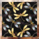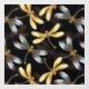Motif sans couture avec or, bijoux, libellules brillantes avec ailes détaillées et pétillantes sur arrière - plan noir. libellule d'or.