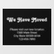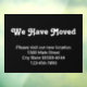 Ce panneau d'annonce de déménagement a un texte blanc que vous pouvez personnaliser. Ce panneau noir indique actuellement Nous Avons Déménagé Veuillez Visiter Notre Nouveau Magasin. Des lignes de texte supplémentaires peuvent être personnalisées pour votre nouvelle adresse et votre numéro de téléphone.