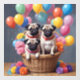 Trois carlins adorables sont installés dans un panier en osier débordant de fleurs colorées. Un joyeux tas de ballons de différentes teintes flottent au-dessus d'eux, ajoutant ainsi à l'ambiance festive. Les carlins, portant chacun un collier rouge, regardent directement le spectateur avec leurs expressions attachantes signature.