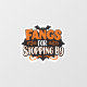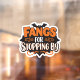 Un autocollant humoristique sur le thème de l'Halloween, avec l'expression "Fangs for Stopping By" en typographie audacieuse et attrayante. Le mot "Fangs" se distingue par des lettres de blocs orange vif, tandis que "FOR" apparaît dans un texte blanc vif, et "STOPPING BY" est coiffé de lettres blanches et orangées. Les tourbillons oranges décoratifs apportent une touche festive. Une grande silhouette de chauve-souris noire forme le fond, avec des chauves-souris volantes supplémentaires de chaque côté pour un flair éffrayant supplémentaire. Idéal pour les fêtes d'Halloween, les décorations de tour à tour, ou comme un accent saisonnier amusant pour les invitations, les sacs cadeaux et le matériel de marketing.
