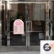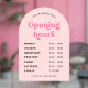 Modèle de décalque de fenêtre d'heures d'ouverture d'entreprise rose rétro avec arche rose poudré et police de style nostalgie. Cet écriteau d'heures d'ouverture éditable comprend un espace pour le nom de votre entreprise, les heures de travail et les coordonnées. Montrez vos jours et heures d'ouverture sur la vitrine de votre magasin avec ce panneau vinyle d'heures d'ouverture groovy - peut être utilisé pour votre café, restaurant, salon ou toute autre entreprise.
