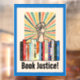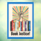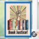 Manifestation contre l'interdiction des livres avec cette image qui présente une étagère de livres interdits, une poing levée de protestation, une explosion de rayons de couleurs et les mots "justice du livre" dans une police rétro. Accentué par une bordure de bleu riche. Ça a l'air super !