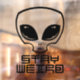 Illustration de la tête de l'alien de dessin avec de grands yeux foncés avec des lettres "Stay Weird". Mots clés : alien, espace, martien, dessin animé, humour, vecteur, science-fiction, séjour, bizarre, espace