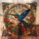 colibri, fleurs rouges floral, style de vitrail art, la nature fleurie de verre taché, beaux animaux en vol, jolies ailes étalées volantes, jardin extérieur jardin jardin jardin, turquoise aqua bleu oiseau bourdonnant, ruby gorge bleu vert, crème d'or jaune art animal