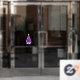 This window cling has a shiny dark pink and silver Christmas tree with stars on a white star shaped rug.