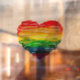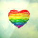 SlipperyJoe's pride griffé forme du coeur dessin arc-en-ciel message d'amour d'inclusion transcende les frontières dégradé couleurs arc-en-ciel vibrante illustration colorée cadeaux gay pride artistiques LGBTQIA lignes inégales rayonnant vers l'extérieur rouge orange jaune vert bleu pourpre dimension