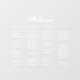 Un simple tableau alphabétique transparent avec 4 colonnes, recommandé pour un mariage, mais utilisable en d'autres occasions aussi. Il s'agit d'un cling de fenêtre, à mettre sur une fenêtre ou une autre surface transparente en verre ou acrylique. Tout le texte est blanc. Le mot Welcome est écrit dans un élégant script calligraphique, le reste en casquette. Les noms sont classés par ordre alphabétique sur 4 colonnes. Au-dessus d'eux et sous le mot Bienvenue, il y a le message "S'il vous plaît trouvez votre siège!".