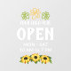 Petits autocollants pour vitrine d'horaires d'ouverture de commerce avec la mention OUVERT en lettres rustiques sous votre logo et vos heures d'ouverture au-dessus de tournesols et de feuilles vertes pour un look campagne chic. Ajoutez vos heures d'ouverture et le logo de votre entreprise. Autocollant de vitrine d'horaires d'ouverture sur le thème des tournesols pour votre magasin, votre boutique ou votre salon avec un design floral lumineux et ensoleillé avec des tournesols et votre logo. Autocollant personnalisé pour la vitrine de votre boutique ou de votre salon avec des tournesols et votre logo.