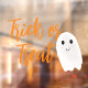 La fenêtre d’Hallowe’en s’accrochant avec "Trick or Treat" écrit dans un script orangé fleuri avec un fantôme amical qui regarde de côté.