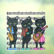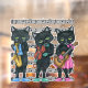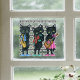 Ce cling de fenêtre comporte trois chats noirs qui jouent des instruments de musique, dont un saxophone, un violon et une guitare, tous portant des gants et des chaussures de différentes couleurs, posés sur une feuille de musique avec des notes de musique.
