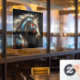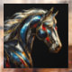 Portrait latéral d'un cheval de style abstrait. Cette oeuvre d'art présente une technique artistique de vitrail aux lignes dorées, remplie de teintes rouges, bleues, oranges, noires et argentées vives contre un arrière - plan sombre. Le résultat est une représentation majestueuse d'un étalon exsumant la splendeur royale.