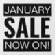 Cet autocollant de fenêtre de haute qualité est conçu pour promouvoir votre entreprise pendant la vente de janvier ou tout autre mois de l'année. Le design est créé sur un fond noir avec du texte transparent, ce qui le rend accrocheur et attrayant.