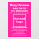 Joyeux Noël ! L'une des fêtes les plus célébrées de l'année. C'est également l'une des meilleures saisons pour faire de la publicité pour votre entreprise ou pour promouvoir votre marque auprès des clients. Autocollant de fenêtre personnalisable avec Soldes de Noël, le nom de votre entreprise et d'autres informations. Autocollant de fenêtre que vous pouvez utiliser comme matériel marketing pour attirer plus de clients. Personnalisez-le et affichez-le pour convaincre davantage de clients d'acheter vos produits ou de faire apprécier vos services à vos clients. Autocollant de fenêtre pour décembre ou Noël en juillet. Les couleurs du design sont des textes blancs sur fond rose. Le contenu comprend un message de Joyeux Noël, des textes de soldes avec pourcentage de réduction que vous offrirez, dates de soldes, nom de votre entreprise, logo, adresse, numéro de téléphone, e-mail et site web ou page de médias sociaux de votre entreprise. Veuillez vérifier l'apparence après avoir téléchargé le logo et saisi les textes. Si l'apparence vous convient, vous pouvez passer votre commande maintenant. Si vous devez redimensionner et déplacer le logo et les textes pour les adapter à cet autocollant de fenêtre ou à la taille et à la forme que vous choisirez, veuillez modifier dans l'outil de conception. Vous pouvez également modifier la couleur de fond, la